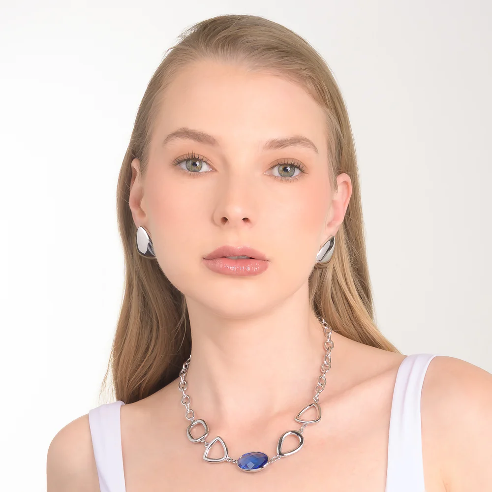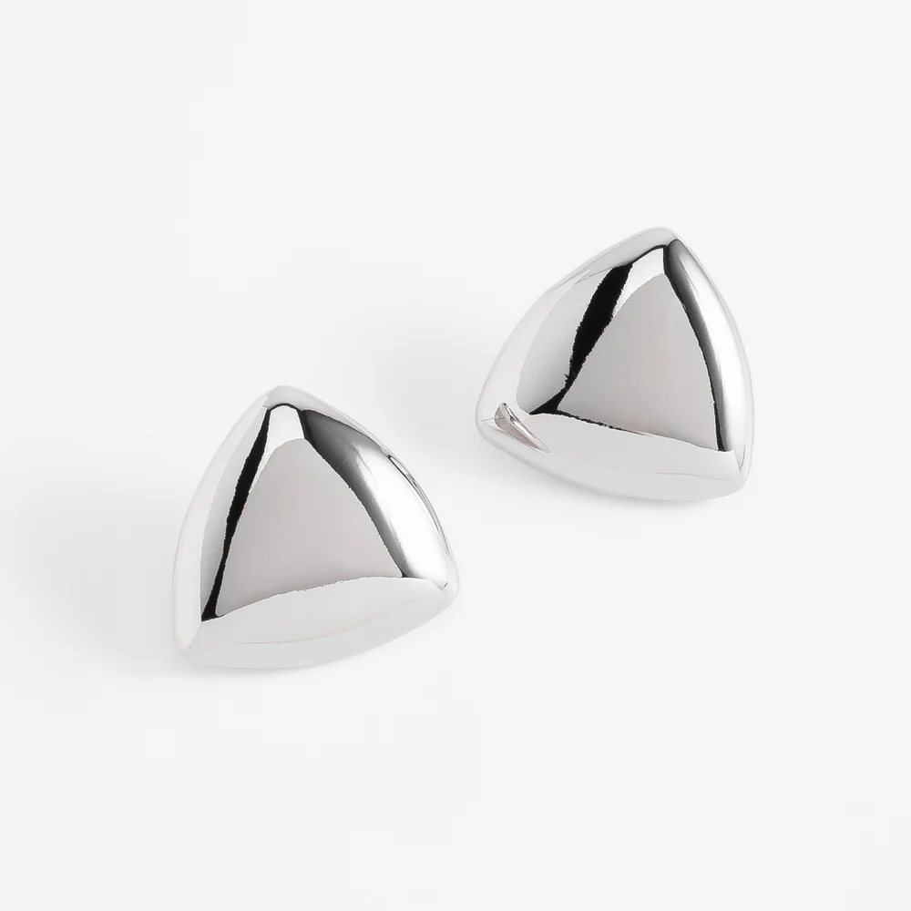 Aretes en baño de rodio con diseño triangular pulido y acabado brillante que aportan un toque contemporáneo y versátil. Ideales para quienes buscan un accesorio con personalidad, capaces de realzar looks cotidianos o complementar combinaciones más formales con un estilo distintivo y moderno.