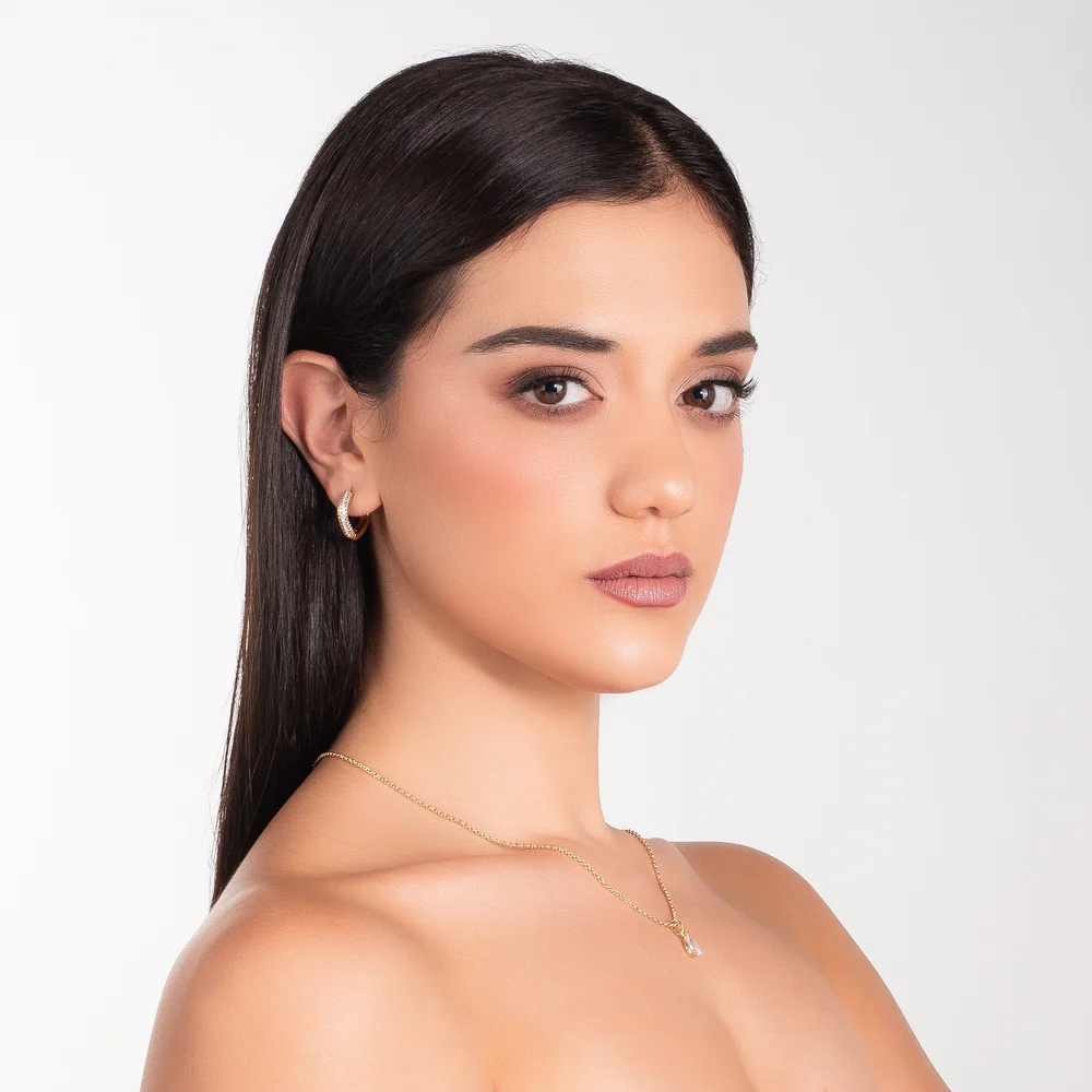 Aretes en baño de oro con diseño tipo huggie e incrustaciones de Diamonice que aportan un toque brillante y sofisticado. Su estilo versátil los convierte en el complemento ideal tanto para atuendos cotidianos como para ocasiones especiales, garantizando un acabado distinguido y lleno de personalidad.