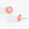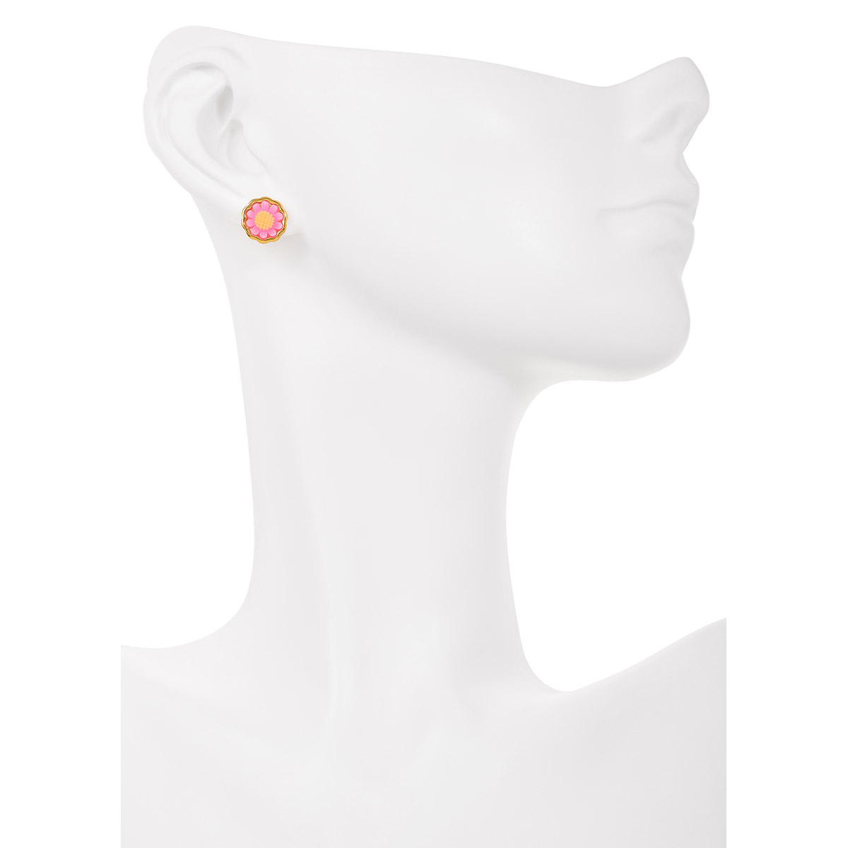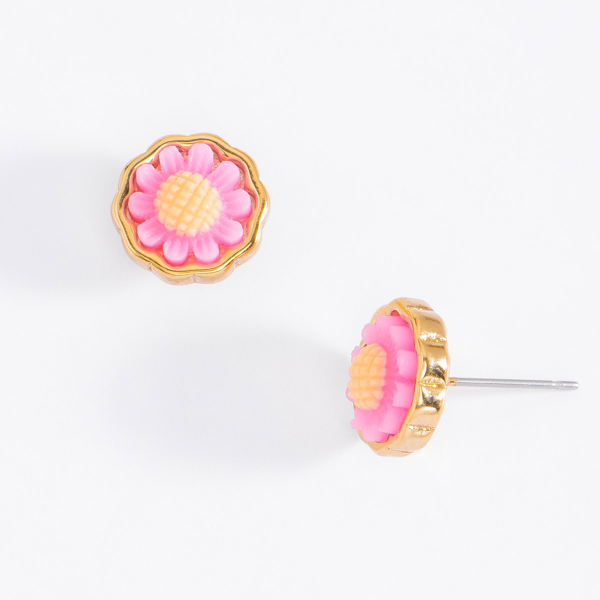 ARETES CON POSTE EN BAÑO DE ORO CON FLOR DE PLÁSTICO EN TONO ROSA