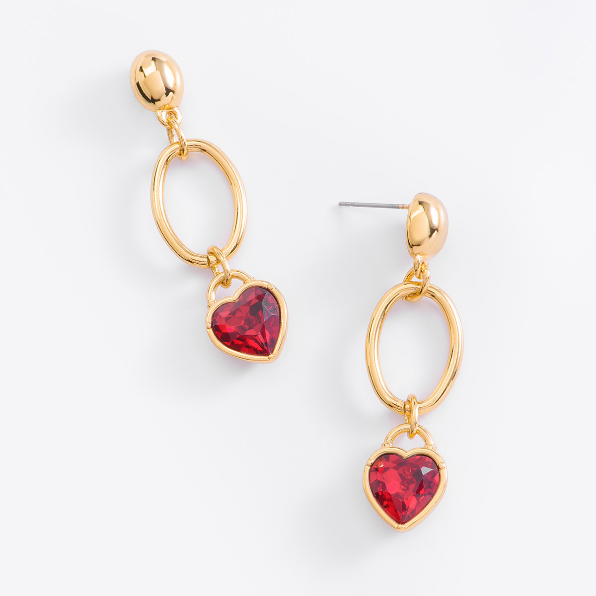 Aretes medianos con aro y corazón, con poste, en baño de oro, con piedra en tono rojo.