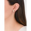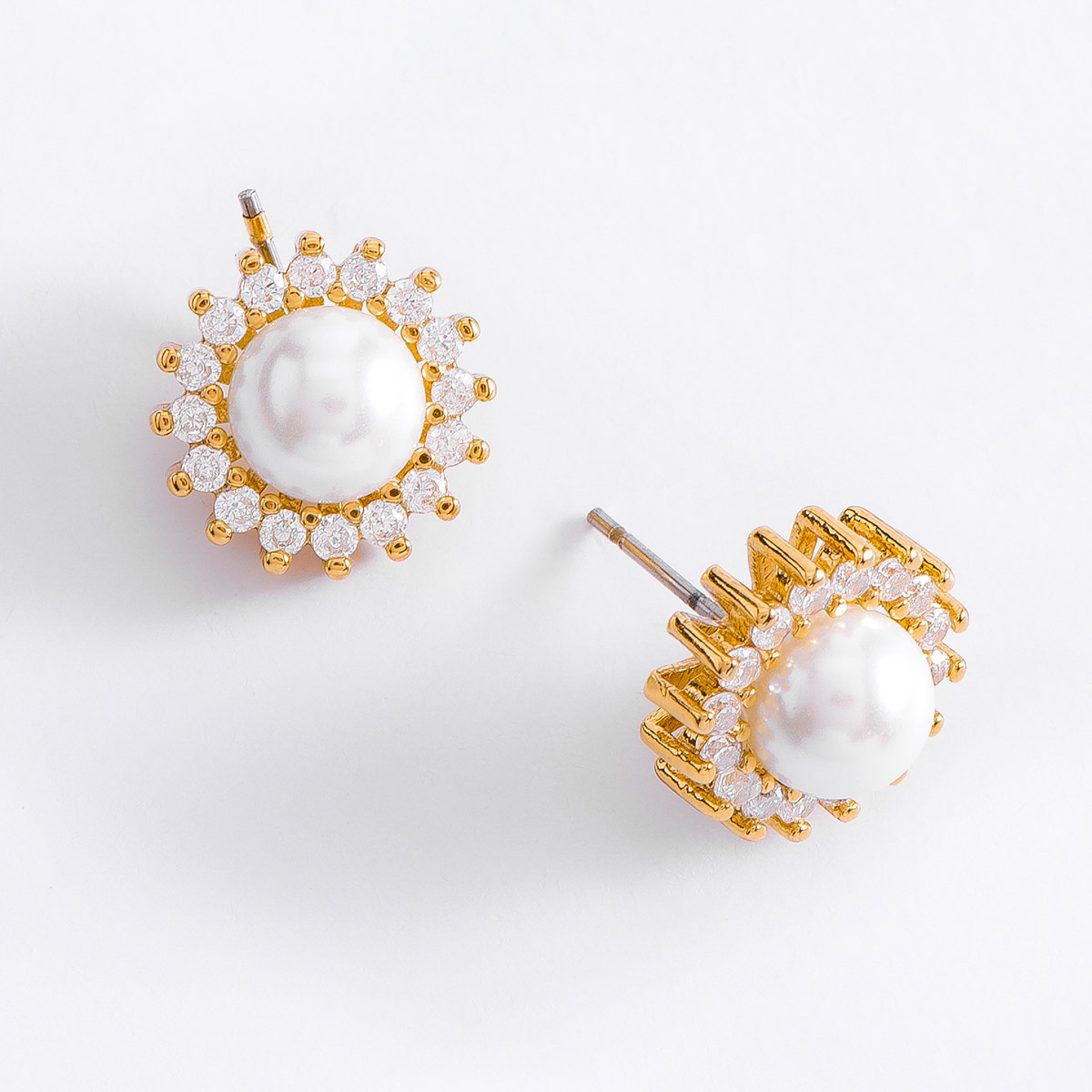 Refinados aretes en baño de oro, con perlas en tono cream e incrustados con nuestra exclusiva piedra Diamonice en tono cristal.