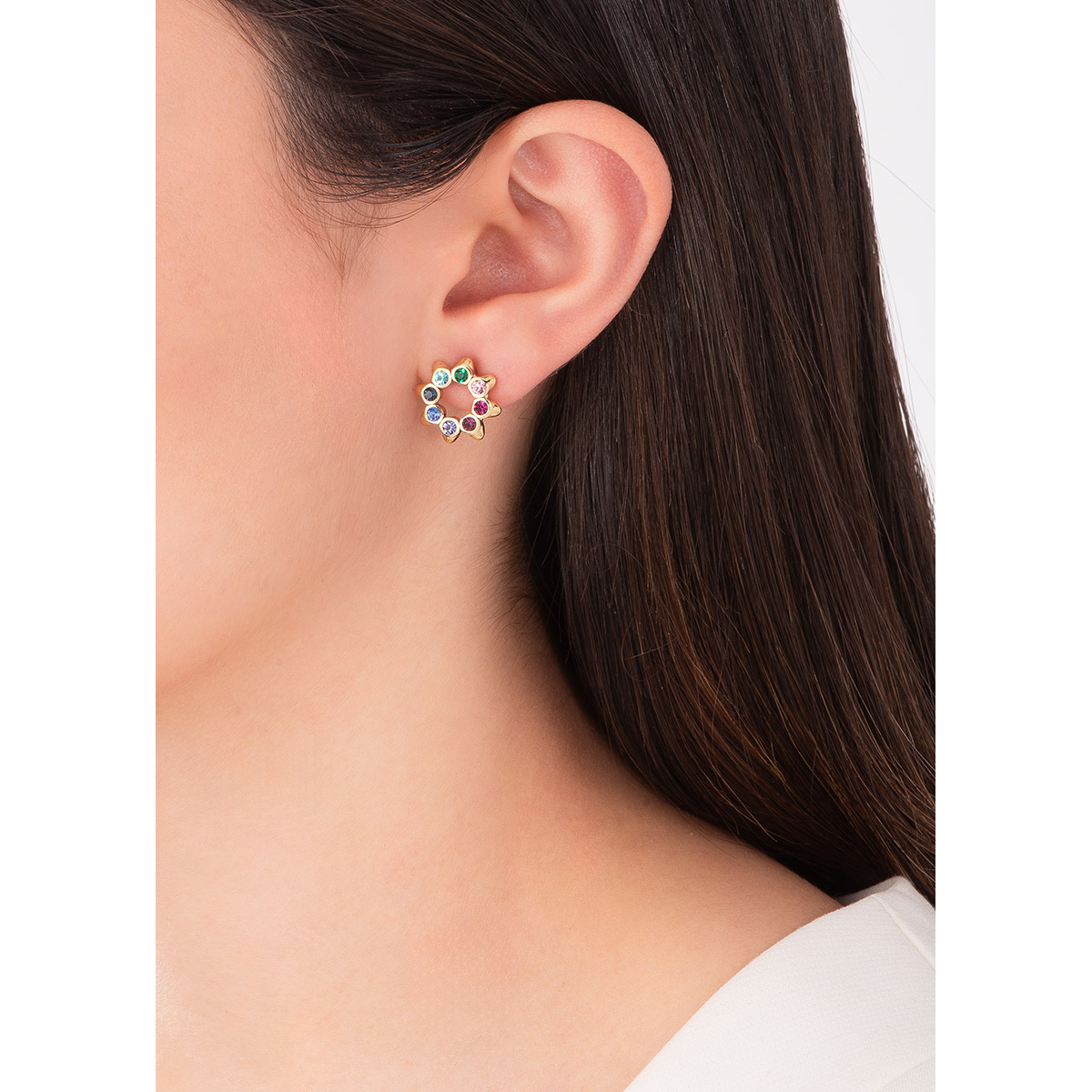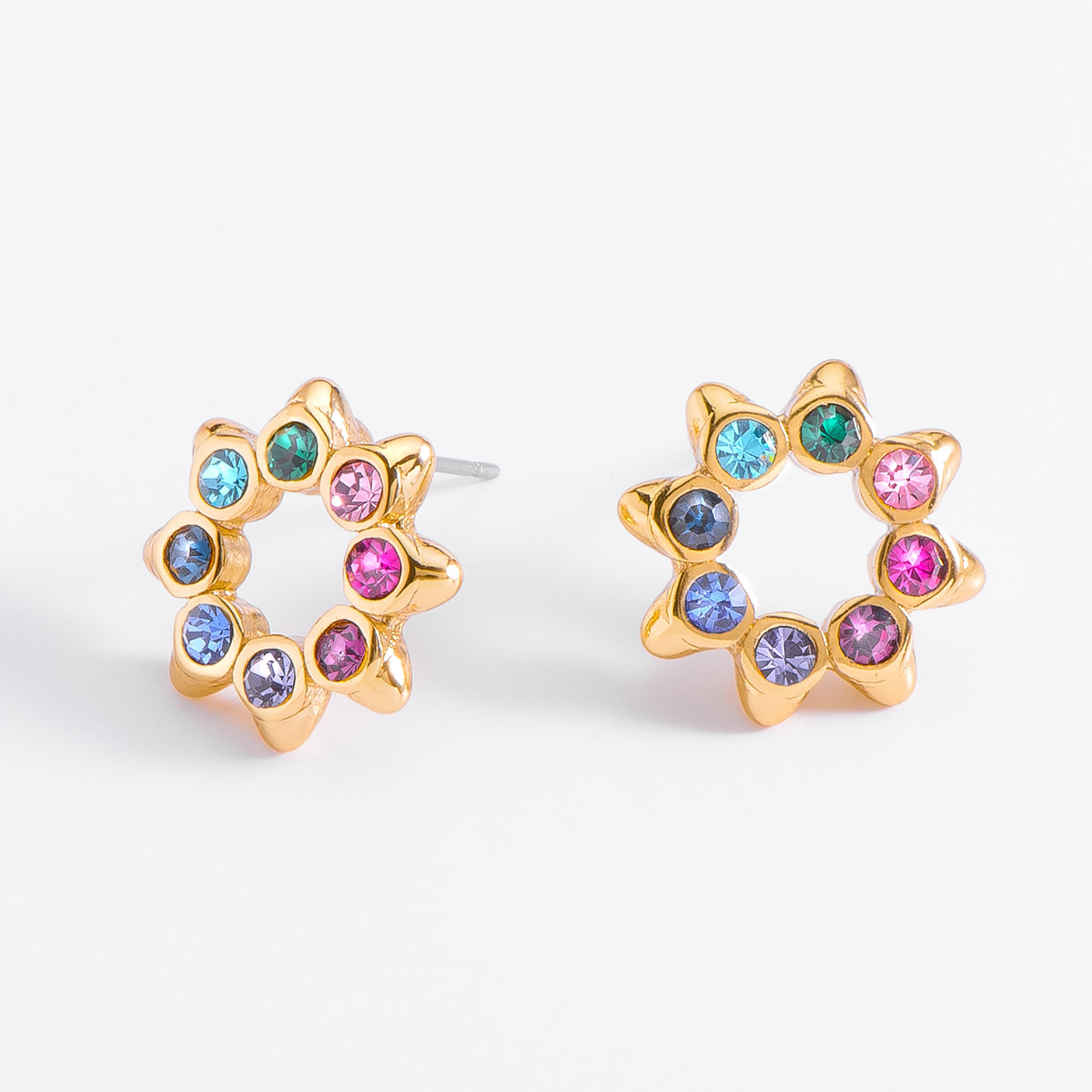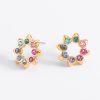 Aretes chicos, con poste, en baño de oro, con piedras en varios tonos.