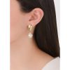 Sofisticados pendientes en baño de oro, con dos dijes colgantes, uno con textura martillada y otro con perla en tono crema.