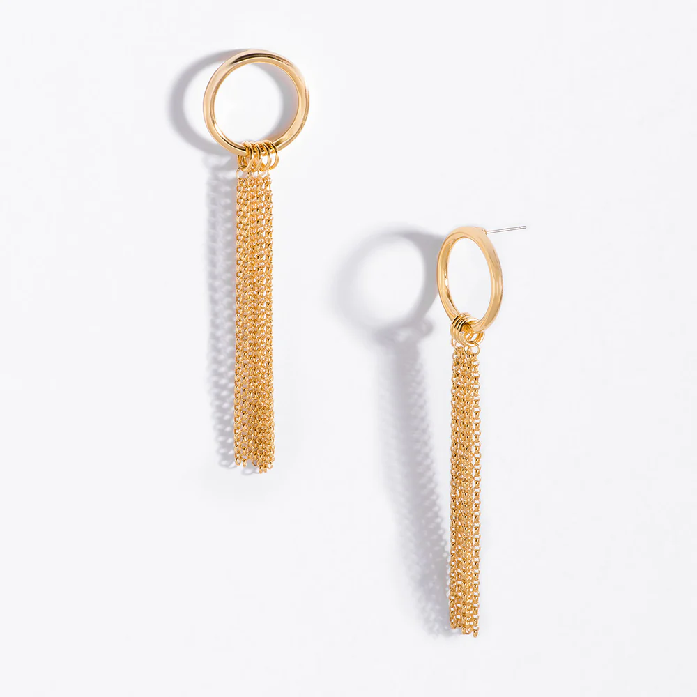 Modernos aretes tipo broquel, ideales para añadir un toque distintivo. Cuentan con un diseño de aro circular del que cuelgan múltiples cadenas, creando un efecto visual dinámico. Perfectos para complementar tu estilo con un acabado pulido de baño de oro.