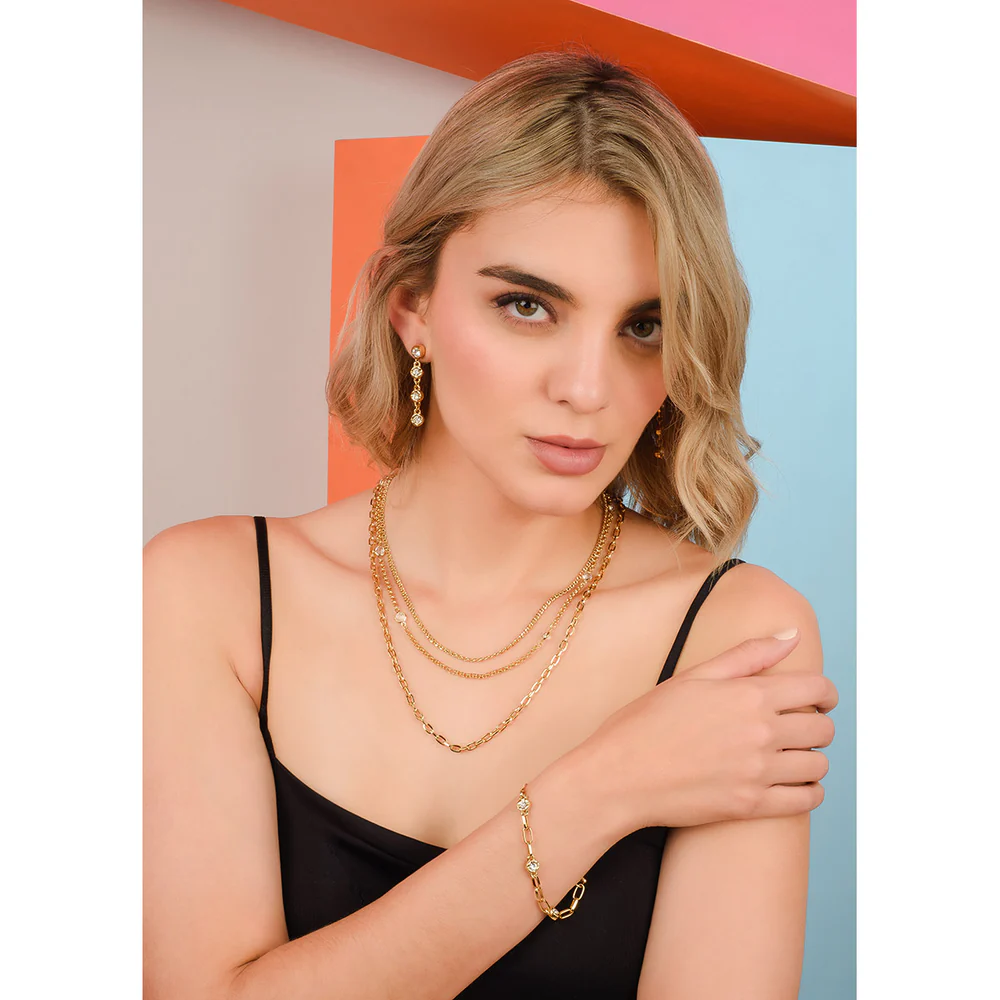 Estos elegantes aretes largos presentan un diseño sofisticado con múltiples cristales brillantes engastados en una delicada cadena. El baño de oro pulido realza su brillo, aportando un toque de lujo discreto. Son perfectos para añadir un destello refinado a cualquier atuendo.