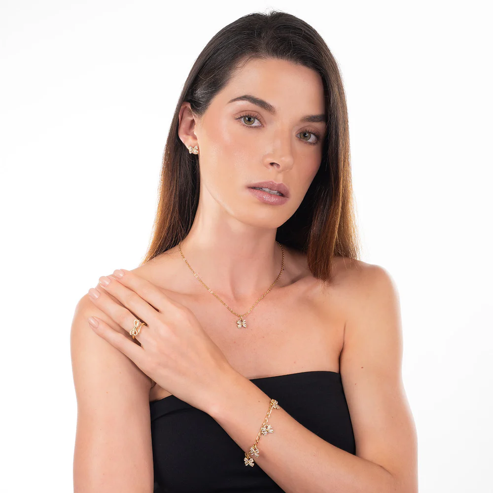 Estos encantadores aretes de poste en forma de moño son el accesorio perfecto para añadir un toque de dulzura y brillo a tu look diario. Con un delicado baño de oro y adornados con brillantes cristales, su diseño es ideal para cualquier ocasión casual.Su tamaño pequeño los hace discretos pero llamativos, ofreciendo comodidad durante todo el día. Combínalos con tu atuendo favorito para un estilo femenino y sofisticado sin esfuerzo.