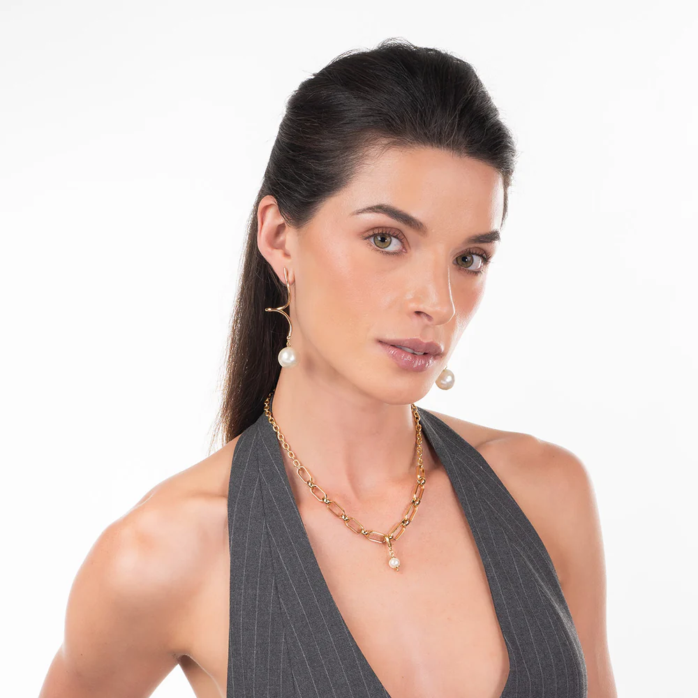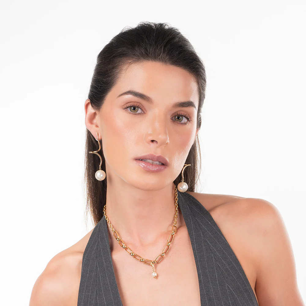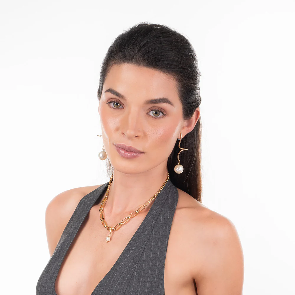 Estos elegantes aretes largos presentan un diseño moderno en espiral con un delicado baño de oro. Cada arete está adornado con una perla de tono crema que añade un toque clásico y sofisticado. Ideales para realzar cualquier atuendo, desde casual hasta formal, su cierre de poste asegura comodidad y sujeción. Perfectos para mujeres que buscan un accesorio versátil y chic.