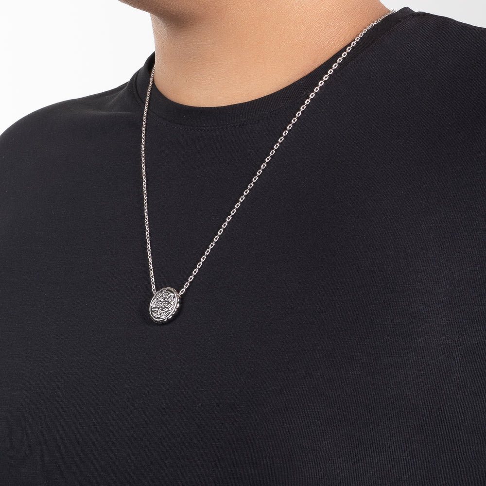 Collar en baño de rodio con colgante circular calado de inspiración floral, que destaca por su diseño detallado y moderno. Un accesorio versátil y distinguido, perfecto para sumar personalidad, refinamiento y un toque contemporáneo tanto en looks formales como casuales.