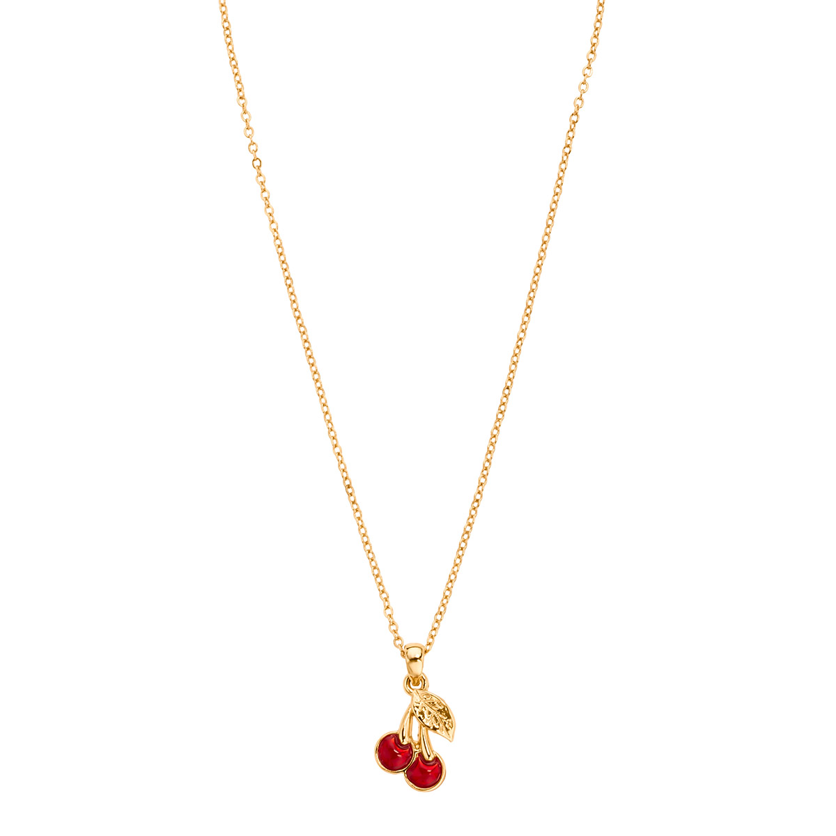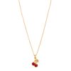 Bonito collar en baño de oro con dije en forma de cerezas con esmalte rojo.