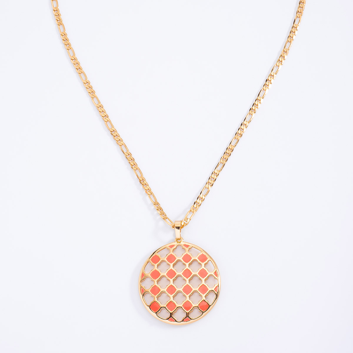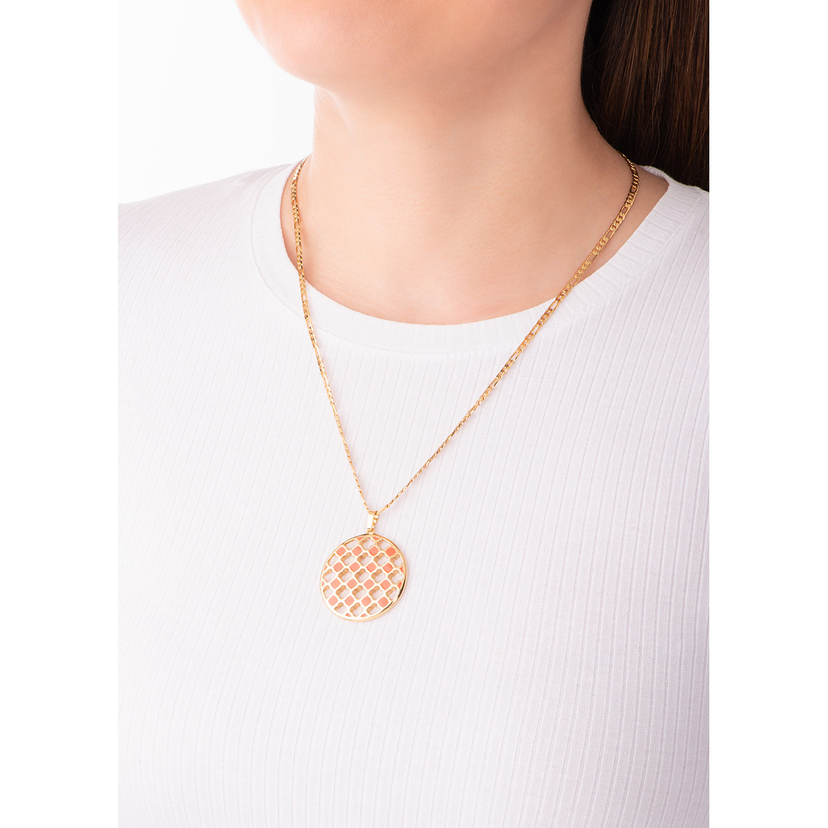 COLLAR EN BAÑO DE ORO DE 50 CM + 10 CM DE EXT. CON PIEDRAS EN TONO CRISTAL Y PINTURA EN TONO CORA