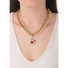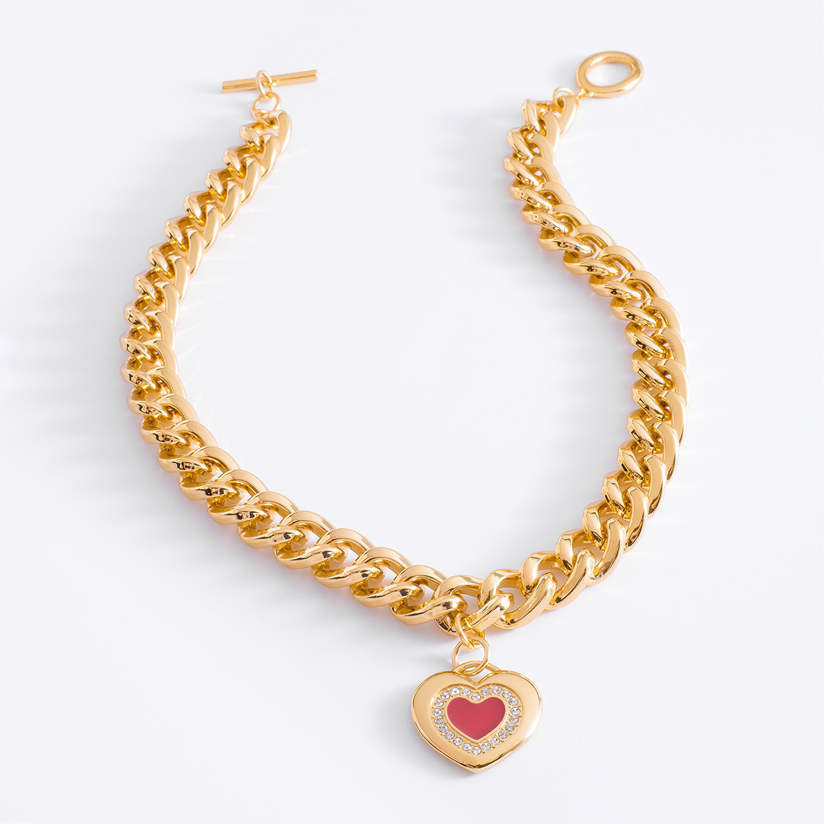 Elegante collar en baño de Baño de oro 18k, con un colgante en forma de corazón con piedras en tono cristal y esmalte en tono rojo.