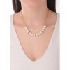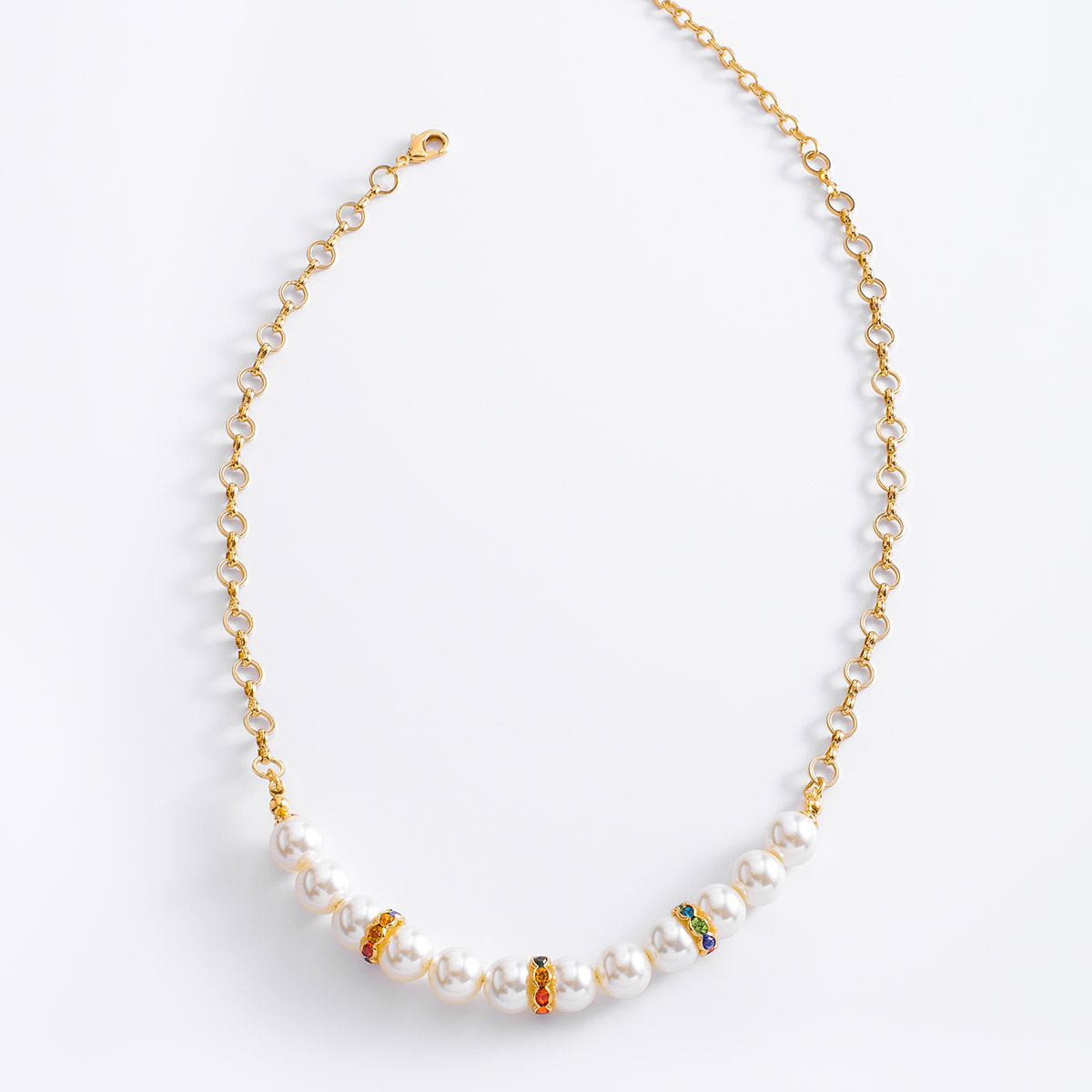 Hermoso collar en baño de oro 18k, con una gran variedad de piedras en varios tonos y perlas en tono crema.
