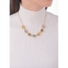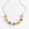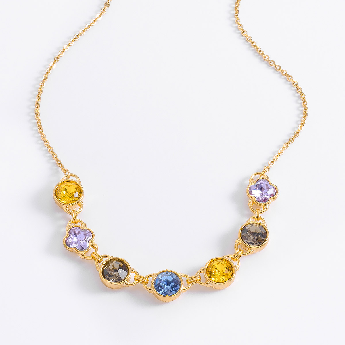 Un juego de luces, formas y colores se unen en este hermoso collar en baño de oro 18k, con piedras en diversas formas y colores, incluyendo amatista, topacio azul, amarillo y lila.