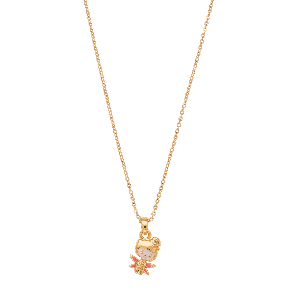 La fantasía y magia de tus sueños se reflejan con este collar en baño de oro con dije de hada con tonos rosas.