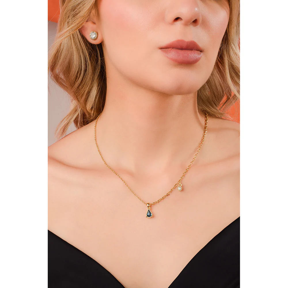 Este collar de mujer bañado en oro presenta una cadena delicada adornada con un dije en forma de gota de piedra azul oscuro y un pequeño charm de cristal. Su diseño versátil es perfecto para añadir un toque de color y sofisticación a tu estilo diario o para ocasiones casuales. Un accesorio moderno y chic que captura miradas.