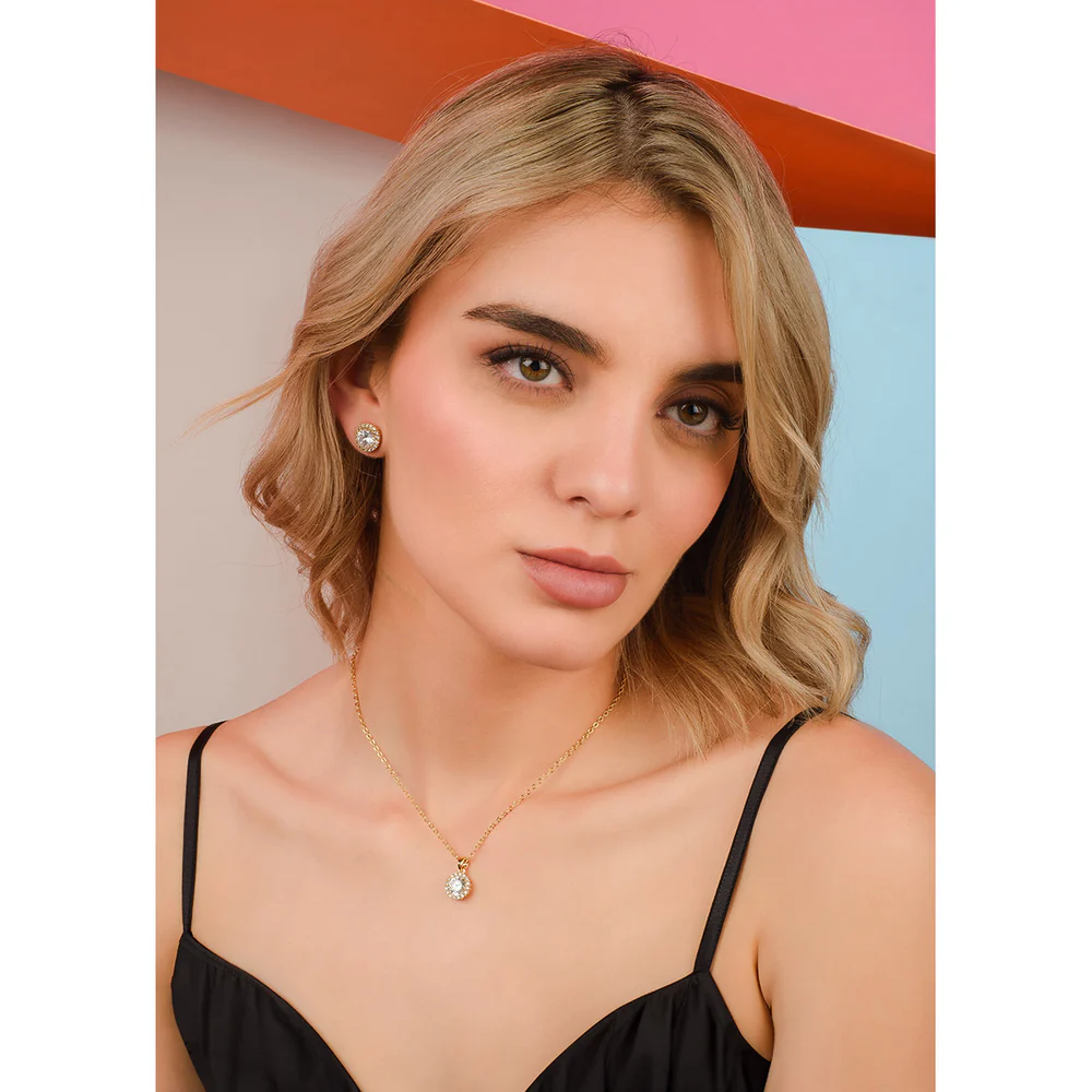 Este elegante collar presenta un deslumbrante dije de Diamonice rodeado de pequeñas gemas que realzan su brillo. Perfecto para añadir un toque sofisticado a cualquier atuendo. Su cadena con baño de oro lo convierte en una pieza duradera y versátil, ideal para uso diario o eventos especiales. Un accesorio esencial que combina belleza y estilo.