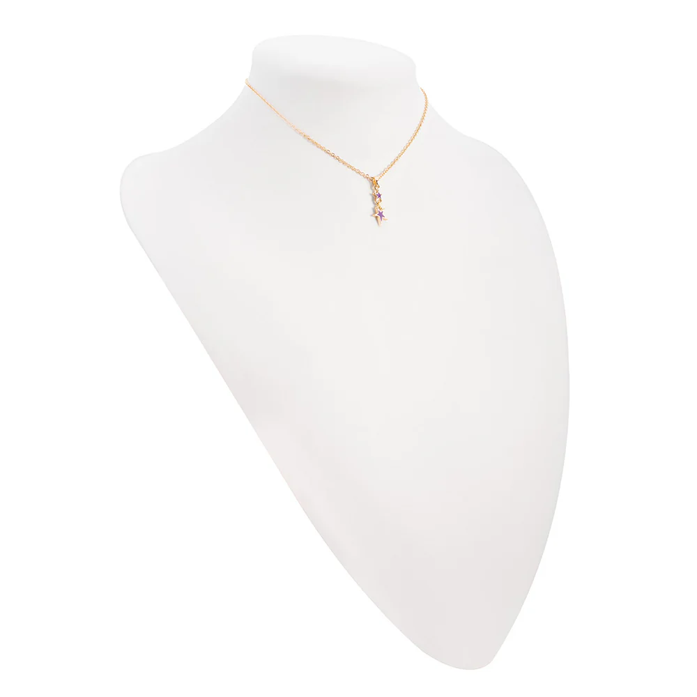 Un collar encantador para niñas, con un delicado diseño de estrellas moradas. La cadena con baño de oro realza el colgante de esmalte vibrante. Perfecto para añadir un toque de alegría y color a cualquier atuendo. Un accesorio divertido y versátil para el día a día.
