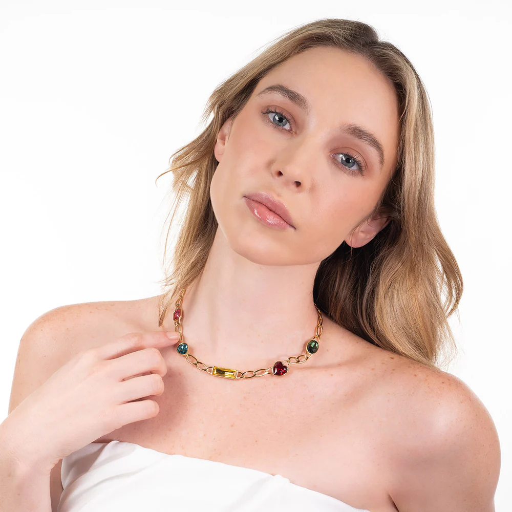 Esta hermosa gargantilla bañada en oro es el accesorio perfecto para añadir un toque de color y sofisticación a tu atuendo. Cuenta con una cadena de eslabones y cinco gemas de diferentes formas y colores, incluyendo ámbar, esmeralda, rojo, azul claro y fucsia. Su diseño versátil la hace ideal para uso diario o para realzar un look casual con un brillo vibrante.