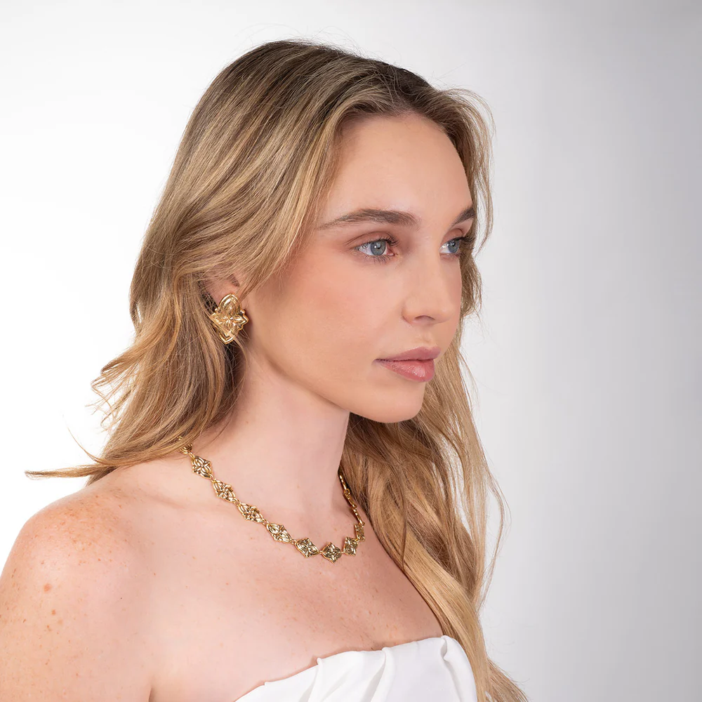 Esta elegante gargantilla es la pieza perfecta para añadir un toque de sofisticación a tu atuendo. Sus eslabones con delicados diseños florales crean un patrón continuo que realza cualquier escote. Ideal para complementar tanto looks diarios como conjuntos más especiales.