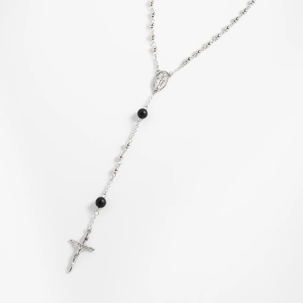 Detalles clave: Crucifijo detallado, Medalla de la Virgen María, cuentas negras