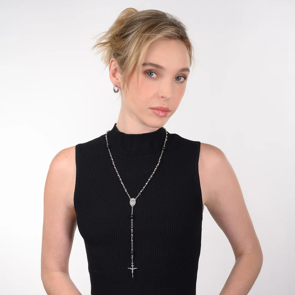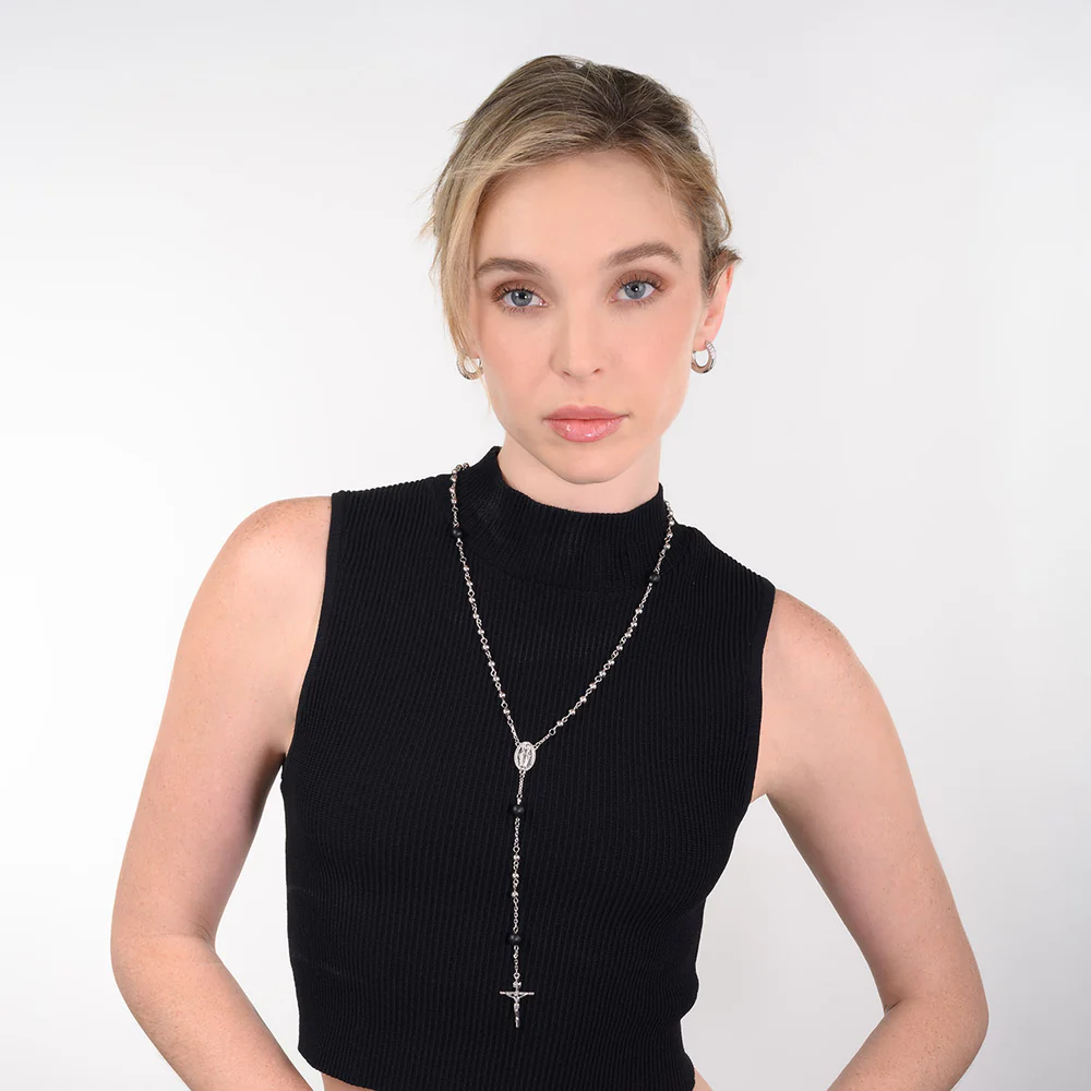 Este rosario unisex combina tradición y estilo con un diseño clásico.Presenta cuentas redondas de color negro profundo que contrastan bellamente con el brillo plateado del baño de rodio.Un crucifijo detallado y una medalla de la Virgen María complementan esta pieza devocional.Ideal para uso personal o como un regalo significativo para cualquier ocasión.