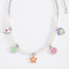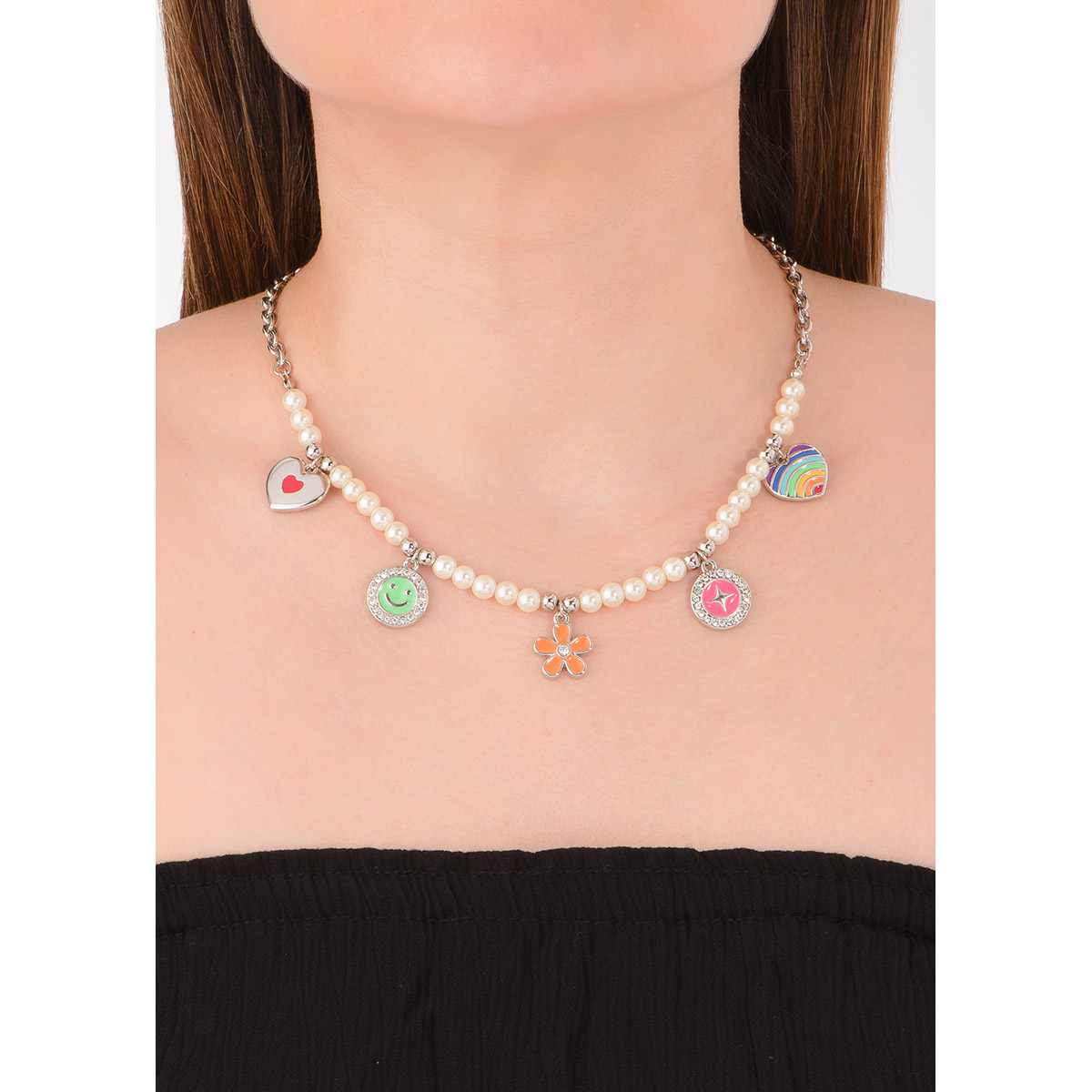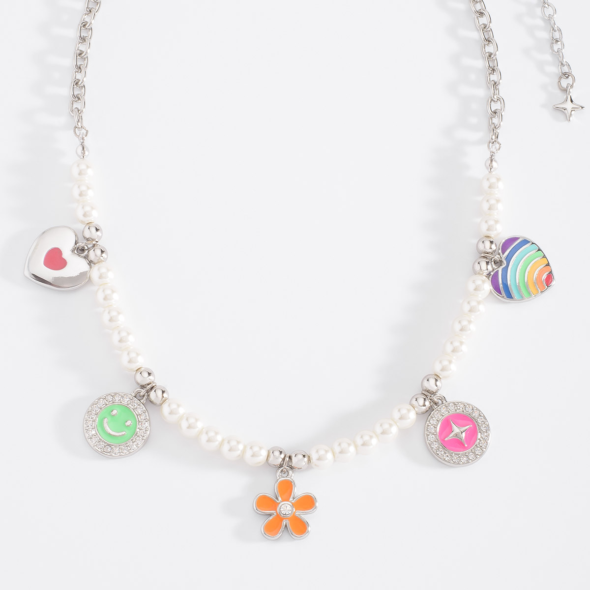 Collar de 42 cm más 10 cm de extensión en platino blanco con perla en tono blanco, piedra color cristal y esmalte en varios tonos