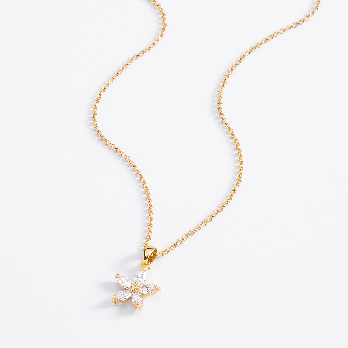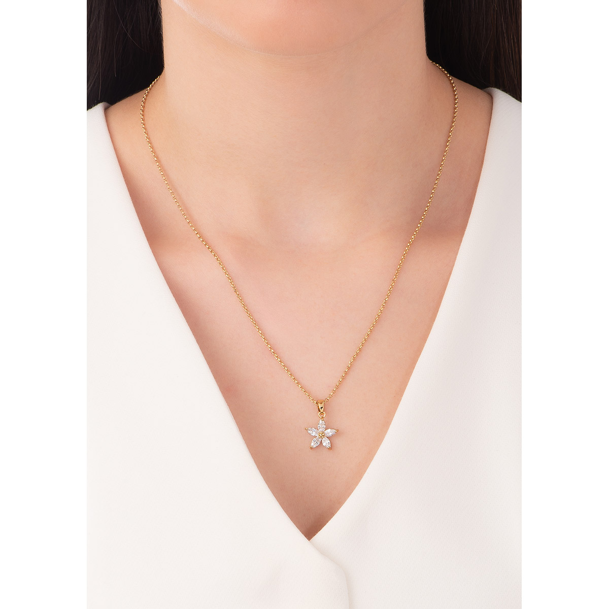Collar con dije en forma de flor, cadena de 45 cm + 10 cm de ext, en baño de oro, con piedra Diamonice en tono cristal.