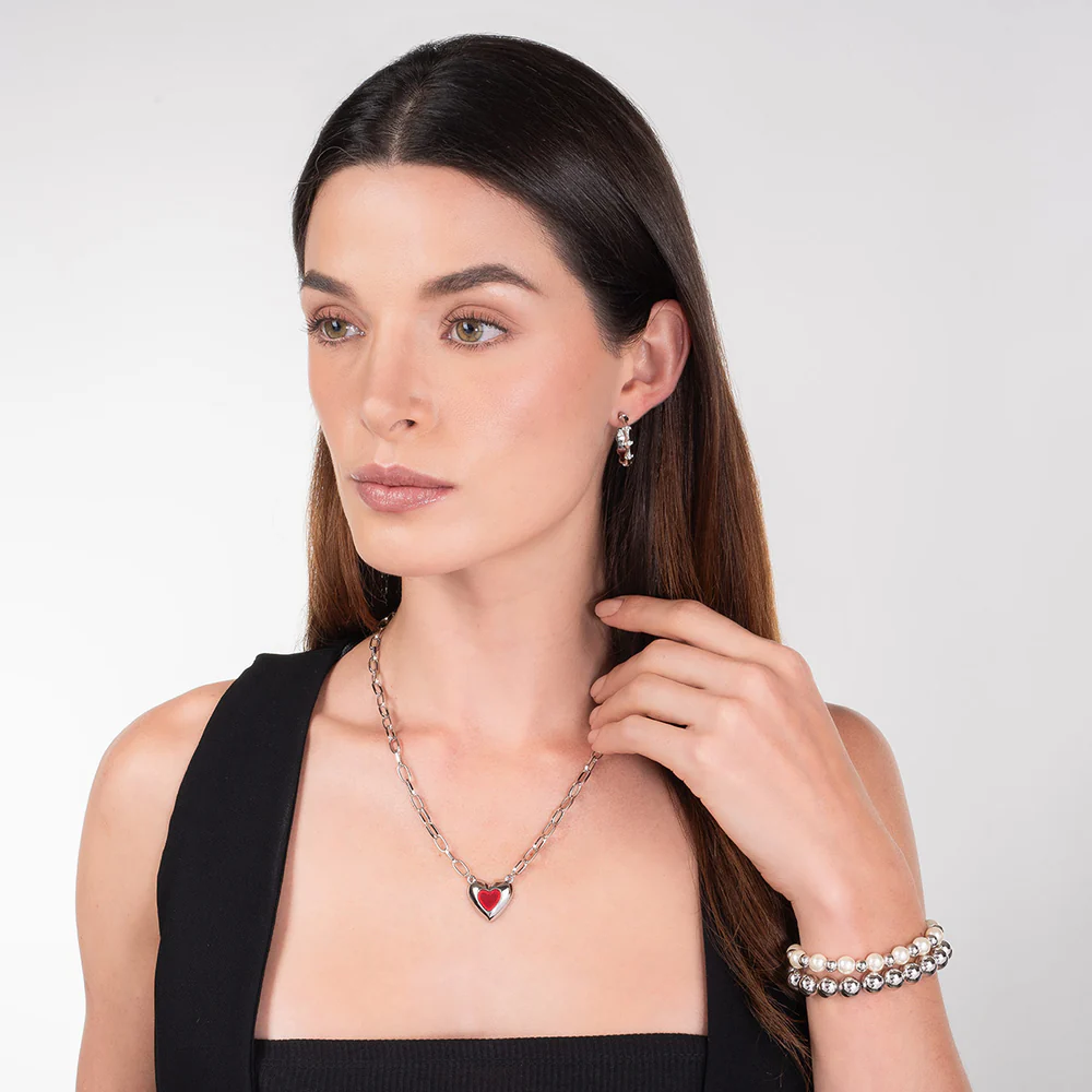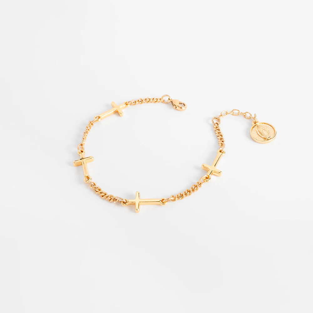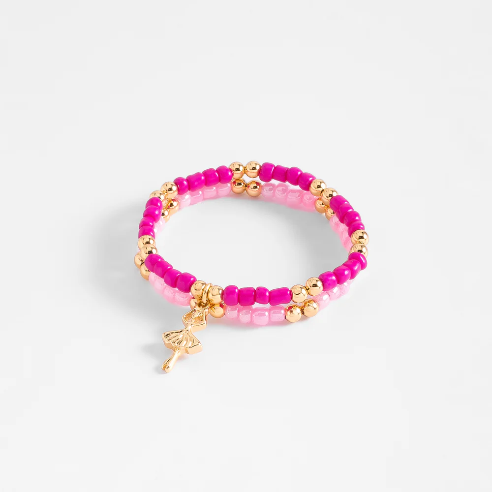 Pulsera en baño de oro con cuentas en tonos fucsia y rosa, acentuada por esferas doradas y un encantador dije de bailarina. Un diseño contemporáneo y juvenil que aporta un toque distintivo, ideal para complementar cualquier look casual o para sumar un detalle especial a tus combinaciones diarias.