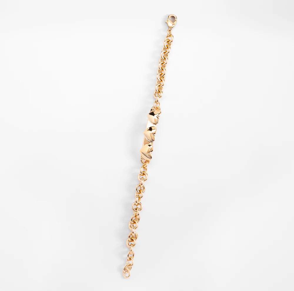 Pulsera en baño de oro formada por eslabones circulares con grabados que aportan luminosidad y un toque distinguido. Su diseño versátil es ideal tanto para complementar un look cotidiano como para dar un matiz moderno a ocasiones especiales, resaltando la personalidad de quien la porta.