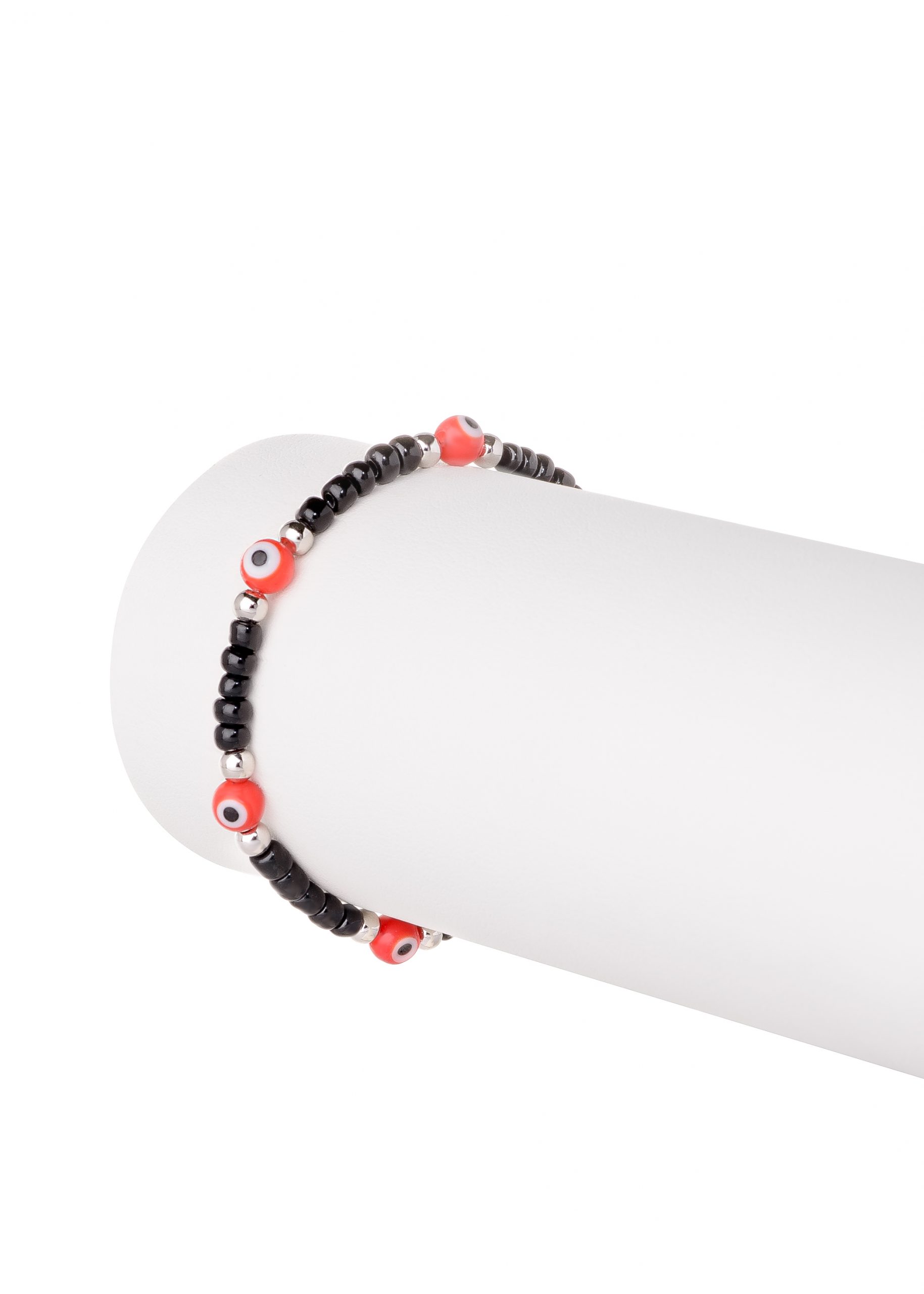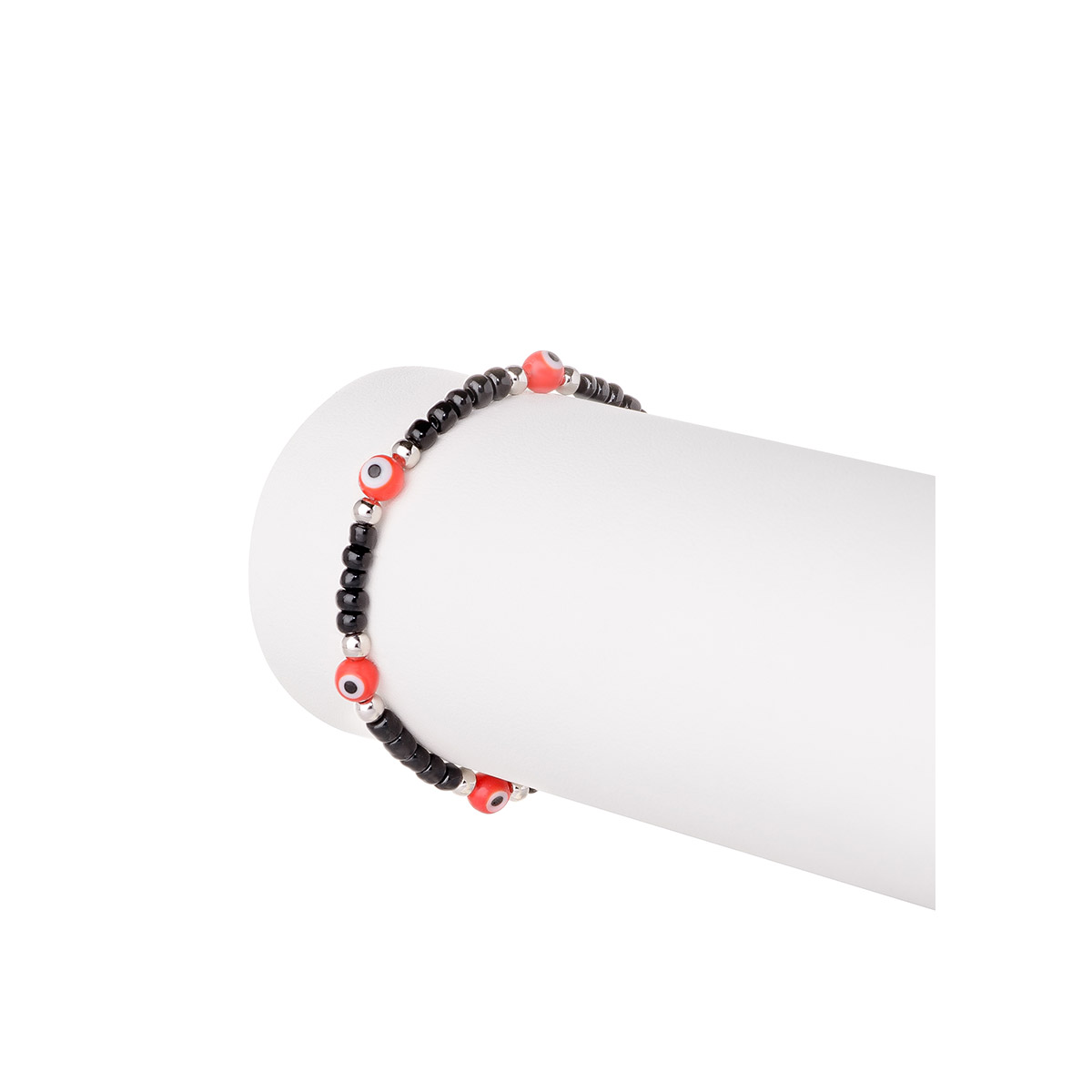 PULSERA EN BAÑO DE PLATINO MEDIDA ÚNICA CON CUENTAS DE COLOR NEGRO Y OJOS DE COLORES