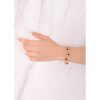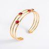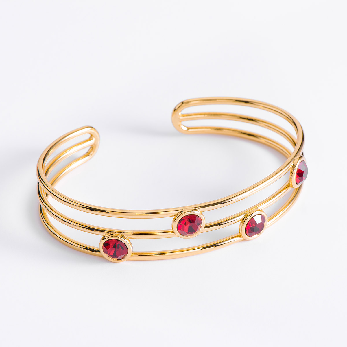 Encantadora pulsera ajustable con diseño de tres líneas en baño de oro 18k, adornada con cuatro piedras en tono rubí.