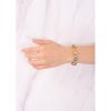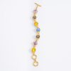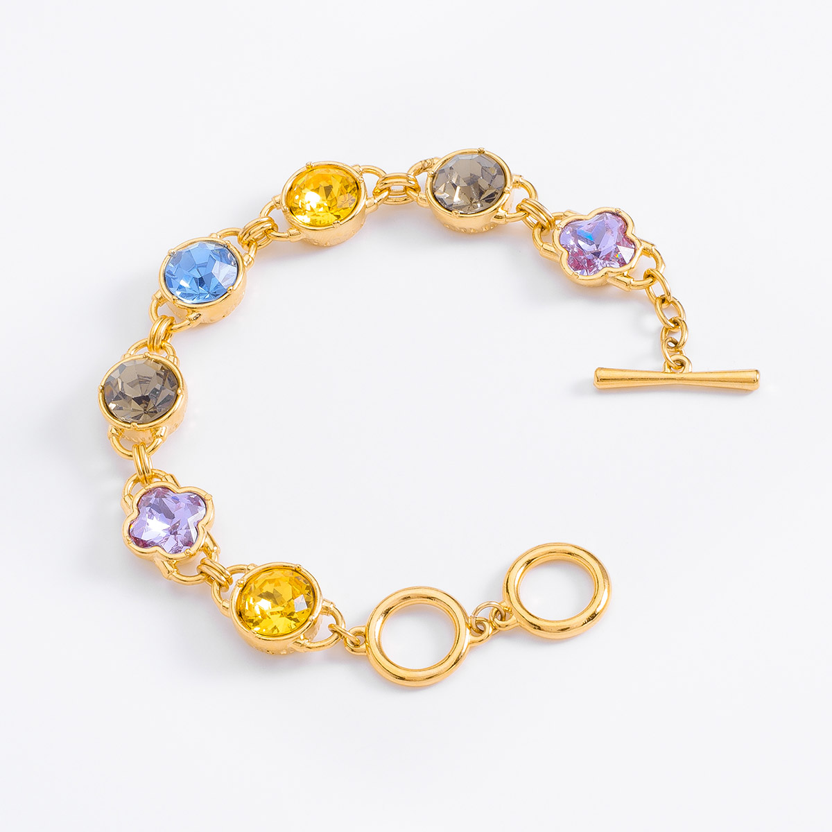 Un juego de luces, formas y colores se unen en esta preciosa pulsera en baño de oro 18k, con piedras redondas en tonos amarillo, azul y verde, y piedras en tono lila con diseño de flor, acompañadas por un delicado marco en tono dorado.