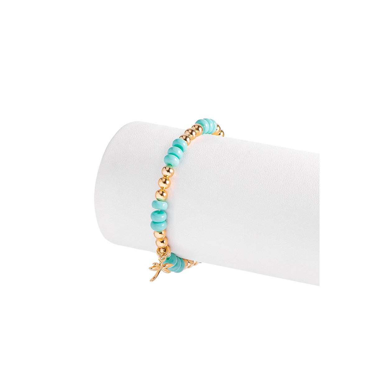 Emocionante pulsera en baño de oro con cuentas en color menta verde, con un dije de libélula que te acompañará todos los días.