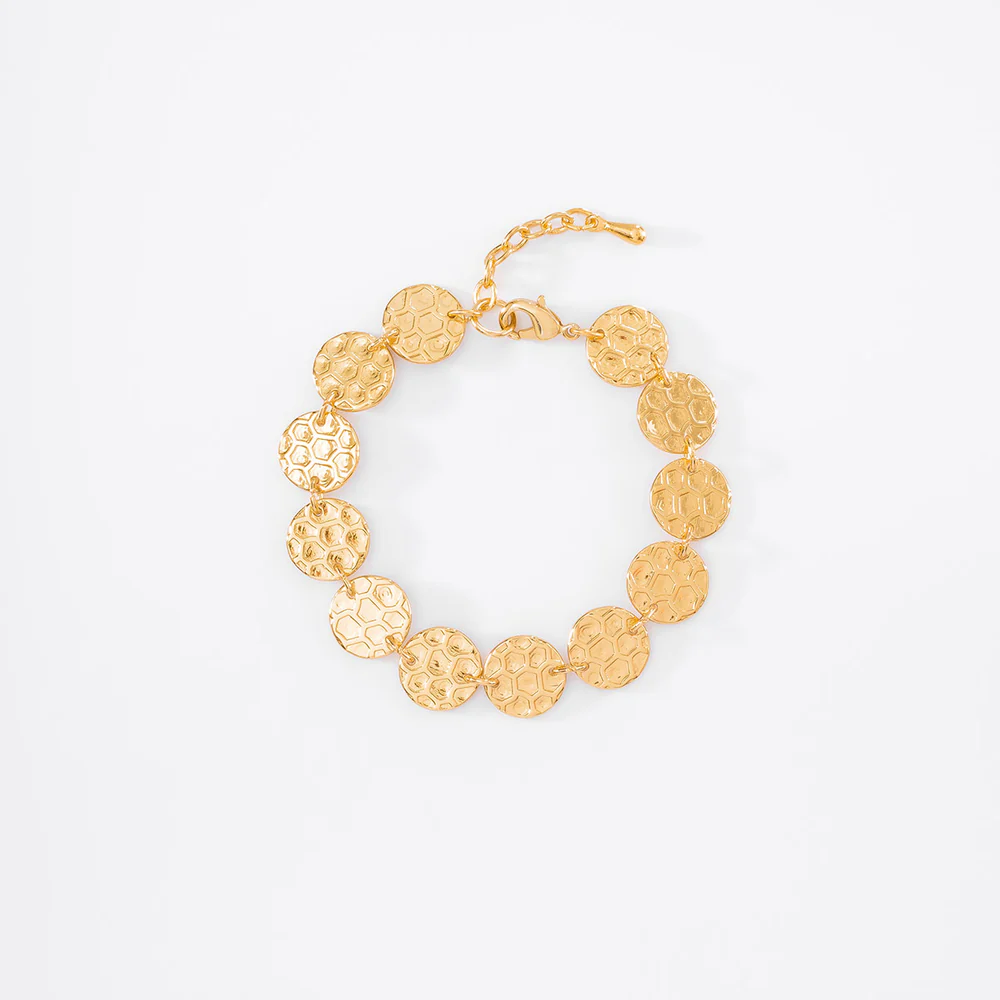 Esta pulsera de eslabones circulares destaca por su elegante baño de oro y un sofisticado acabado texturizado.Perfecta para añadir un toque moderno y versátil a cualquier atuendo, ideal para el uso diario o como un regalo especial.Su diseño único y contemporáneo la convierte en un accesorio imprescindible en tu colección.