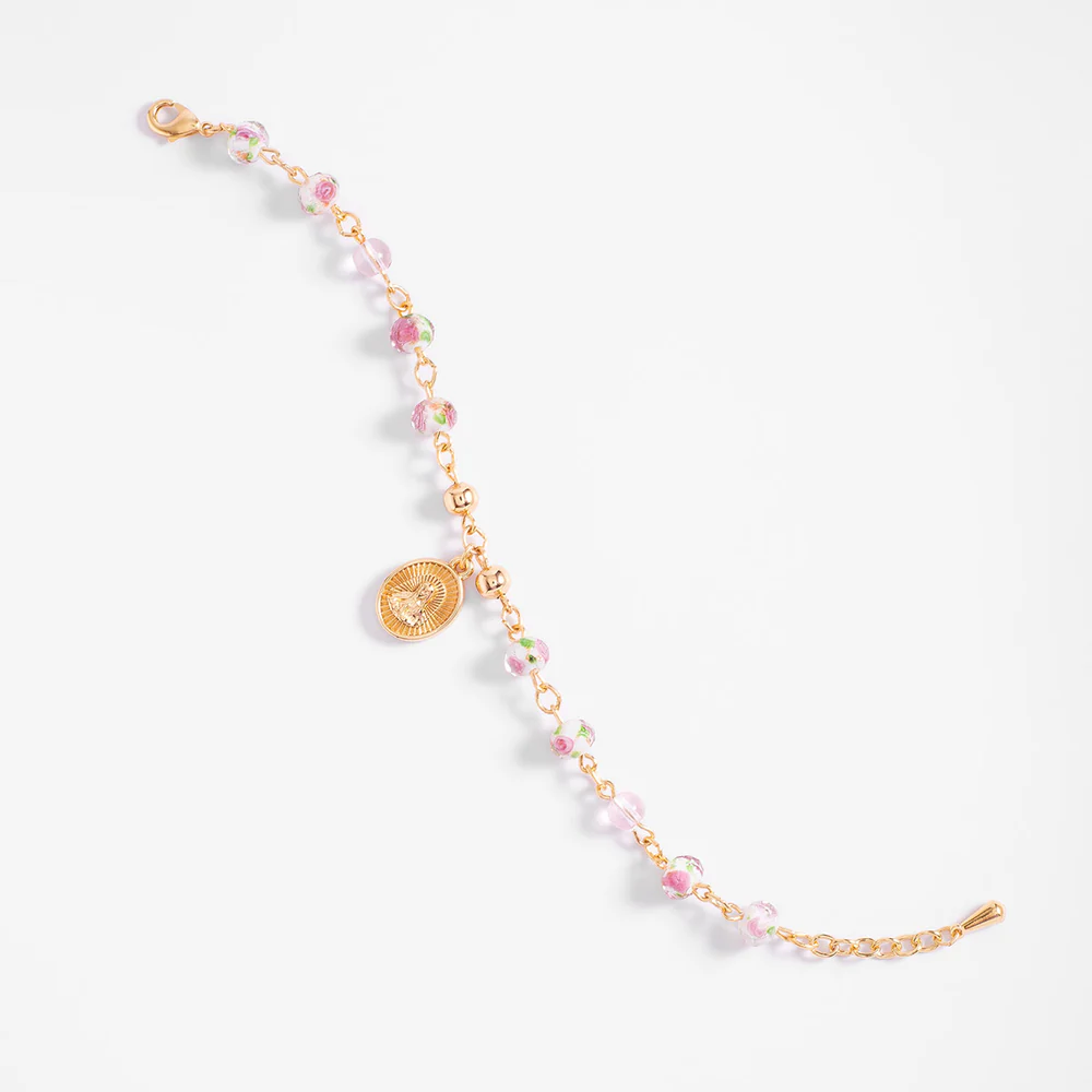 Pulsera ajustable con dije de la Virgen y cuentas florales
