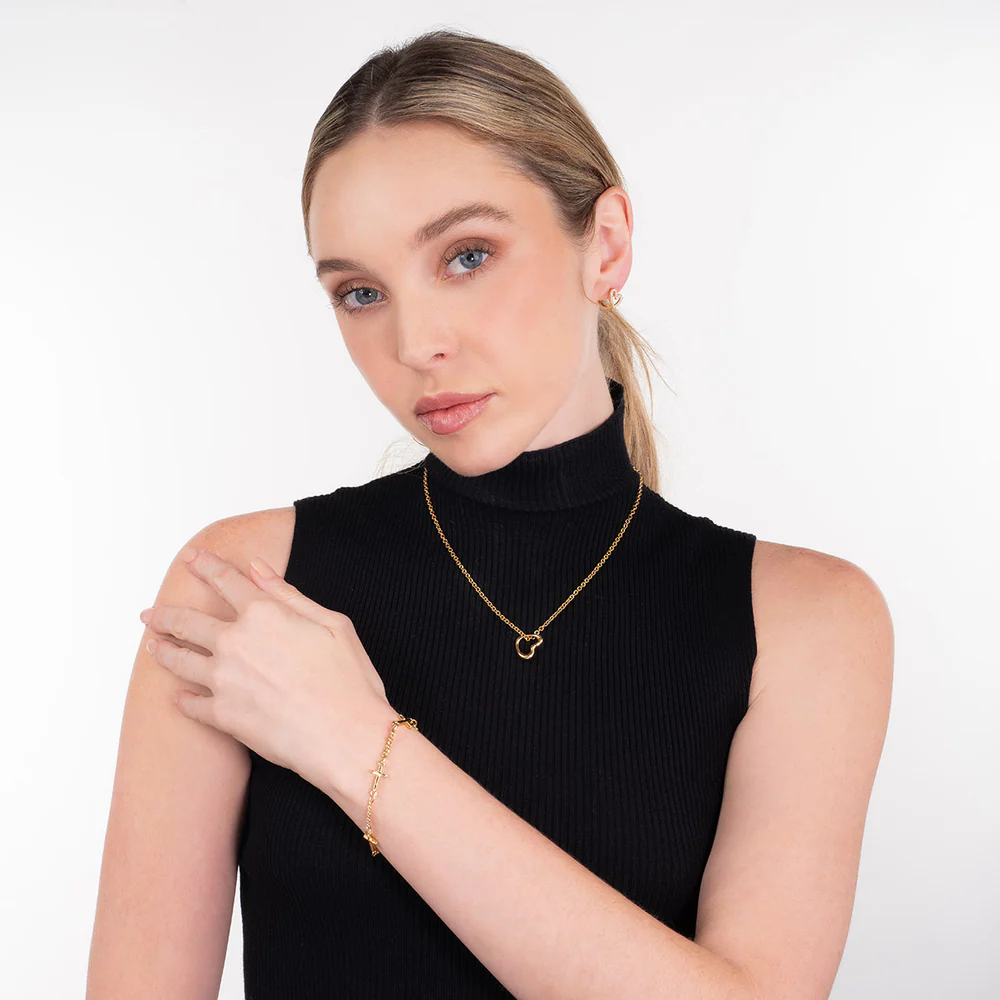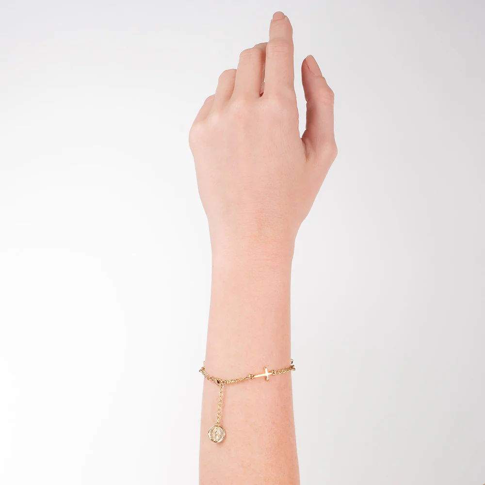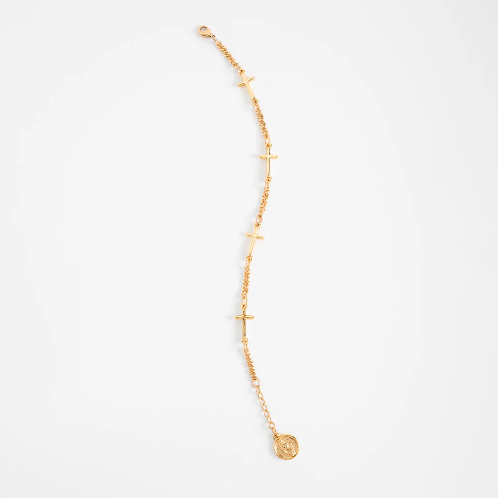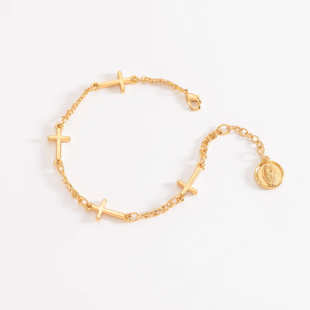 Lleva tu fe y estilo a donde vayas con esta pulsera unisex. Su diseño delicado presenta múltiples cruces a lo largo de una cadena fina, culminando con un dije redondo de la Virgen María. Ideal para uso diario, esta pieza bañada en oro se ajusta cómodamente a tu muñeca, ofreciendo un toque de devoción y elegancia.