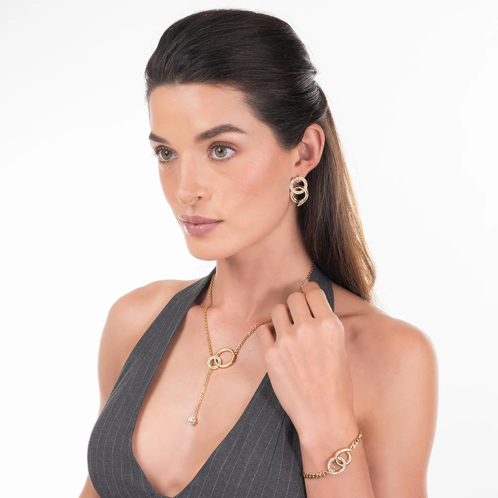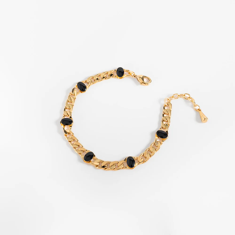 Esta pulsera de cadena con baño de oro es una pieza versátil y moderna. Presenta eslabones gruesos y detalles de esmalte negro que añaden un toque sofisticado. Perfecta para realzar cualquier atuendo, desde casual hasta más formal, proporcionando un estilo atemporal.