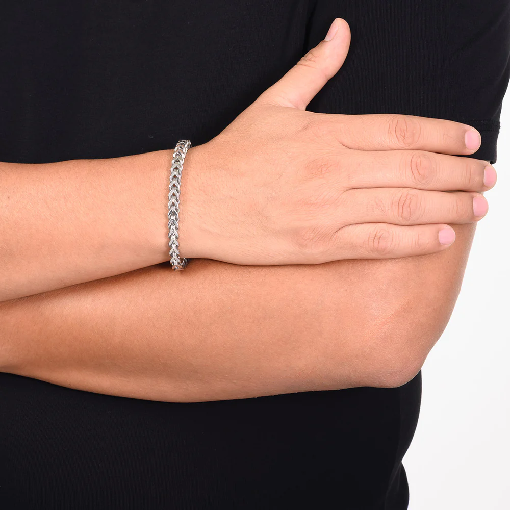 Esta pulsera de cadena para hombre, con un sofisticado baño de rodio, es el complemento ideal para cualquier atuendo. Su diseño de eslabones entrelazados ofrece un estilo moderno y atemporal, perfecto para realzar tu look diario. Una pieza robusta y elegante que combina durabilidad con un brillo distintivo.