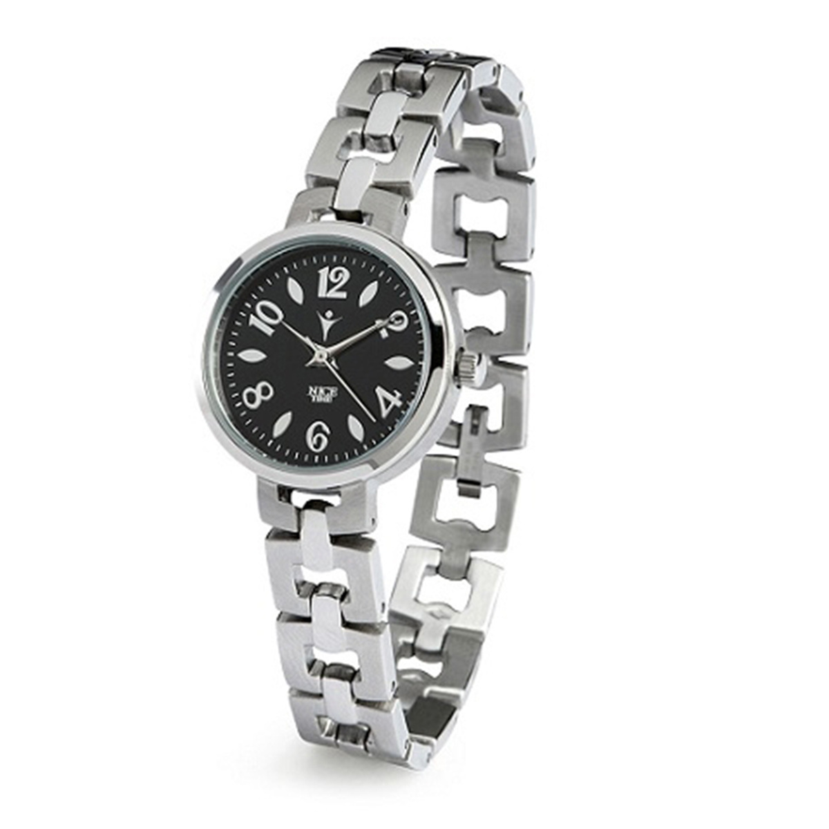 Reloj con correa de acero inoxidable color plata, centro negro y carátula plata