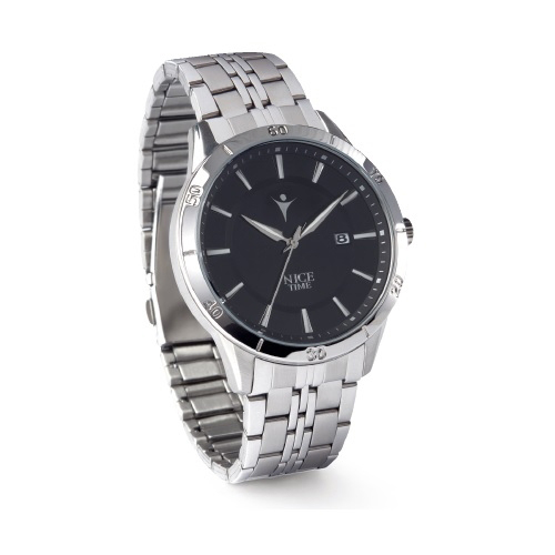 Reloj con correa de acero inoxidable, con carátula en tono platino, centro negro.