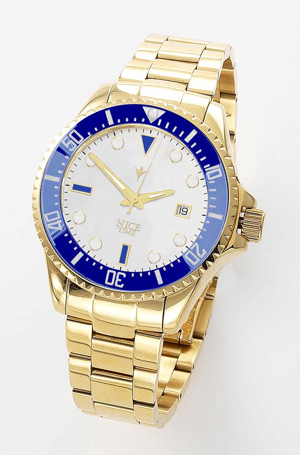 Reloj en baño de oro de 14k, con carátula nácar en números romanos y carátula en tono azul con hermosa correa de acero inoxidable en tono dorado.